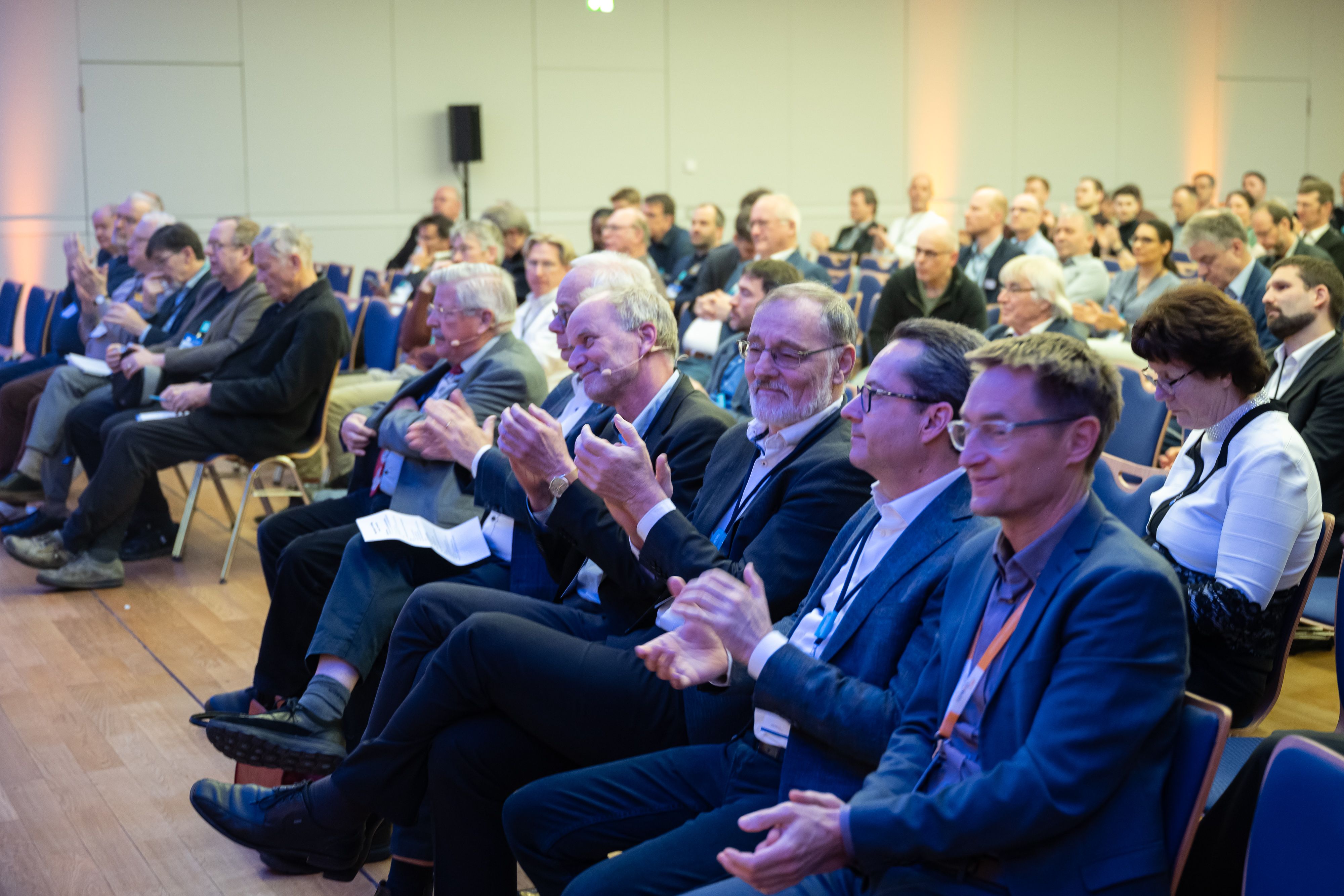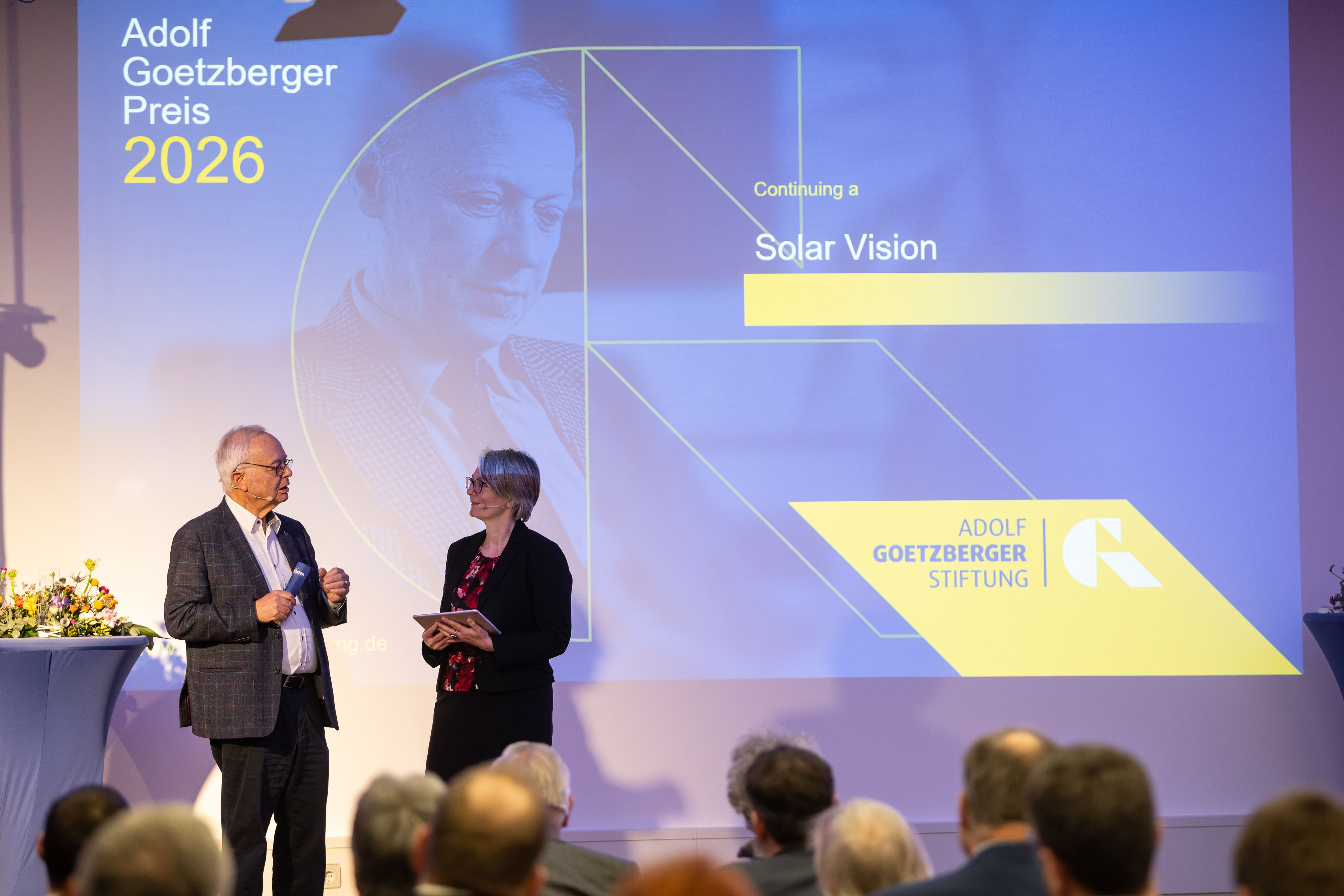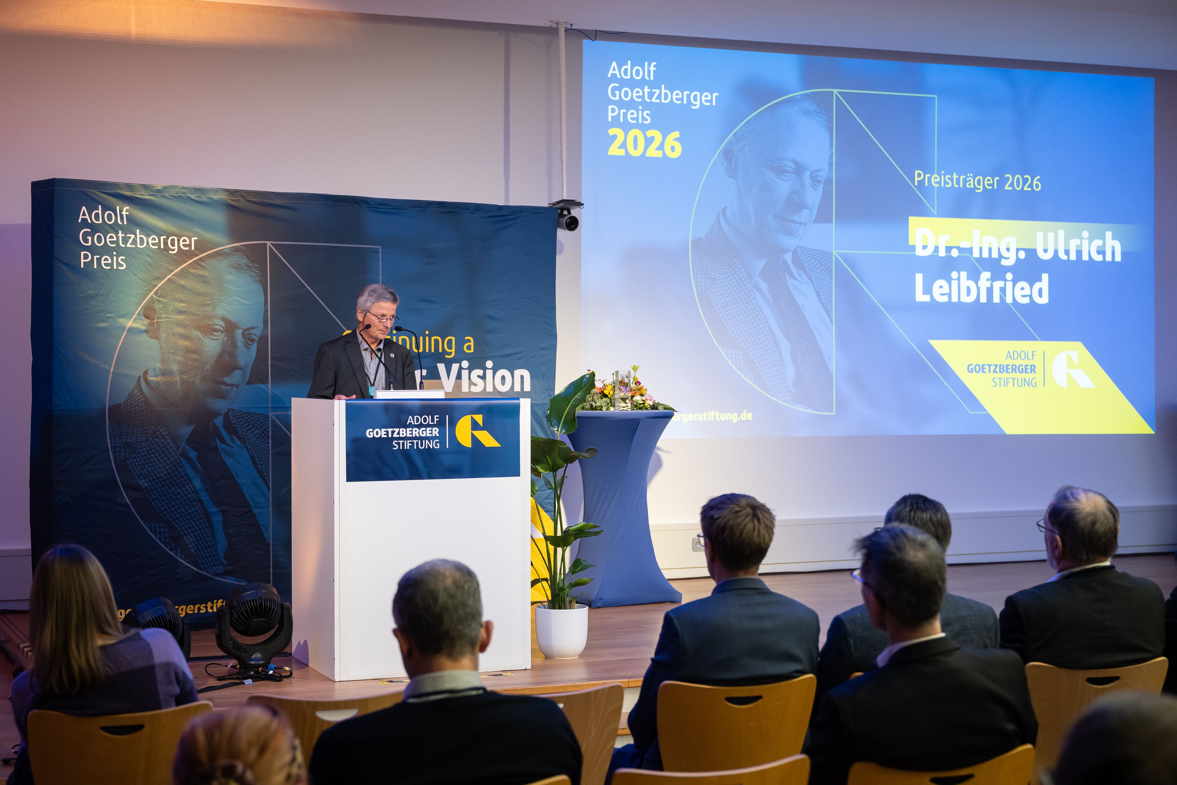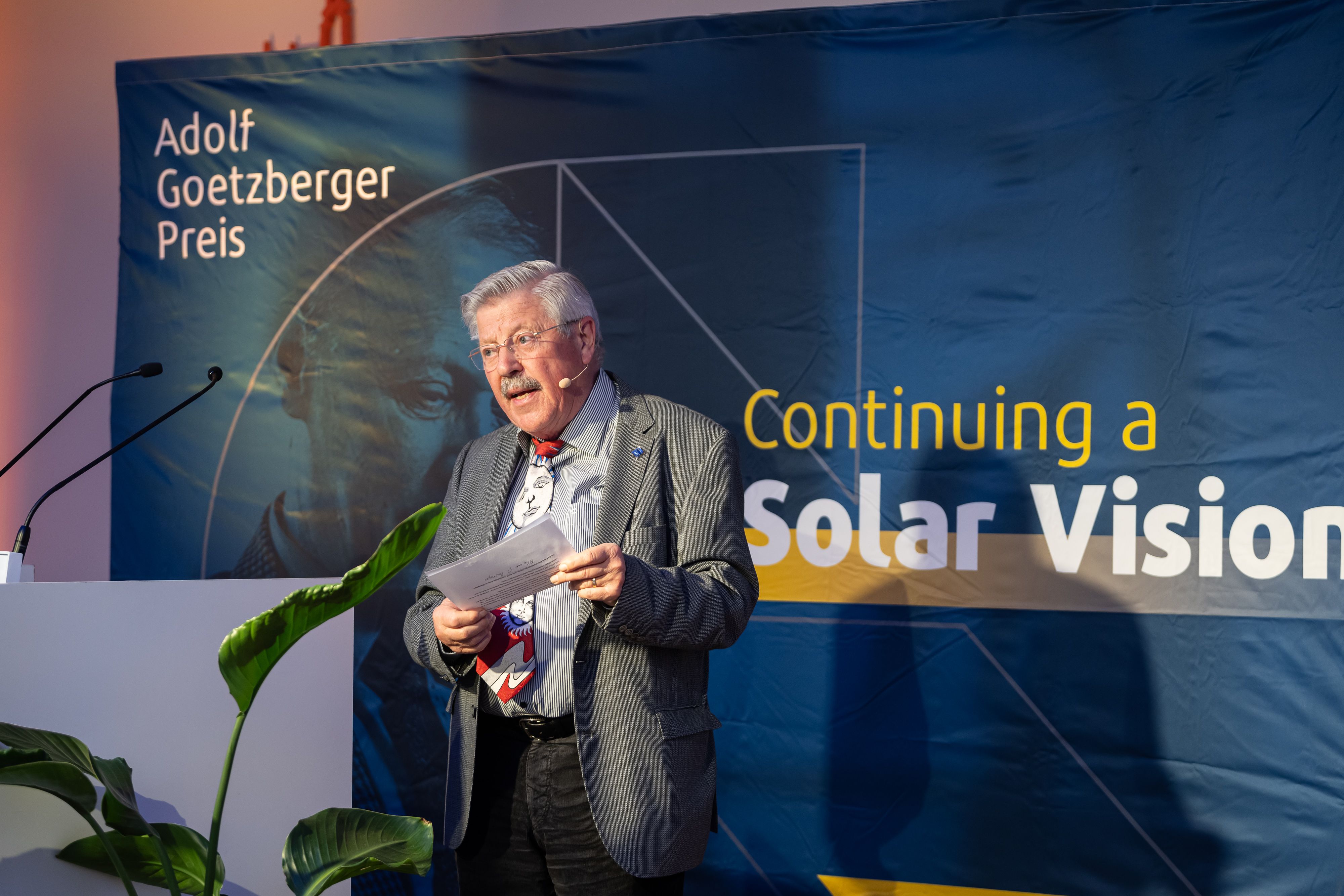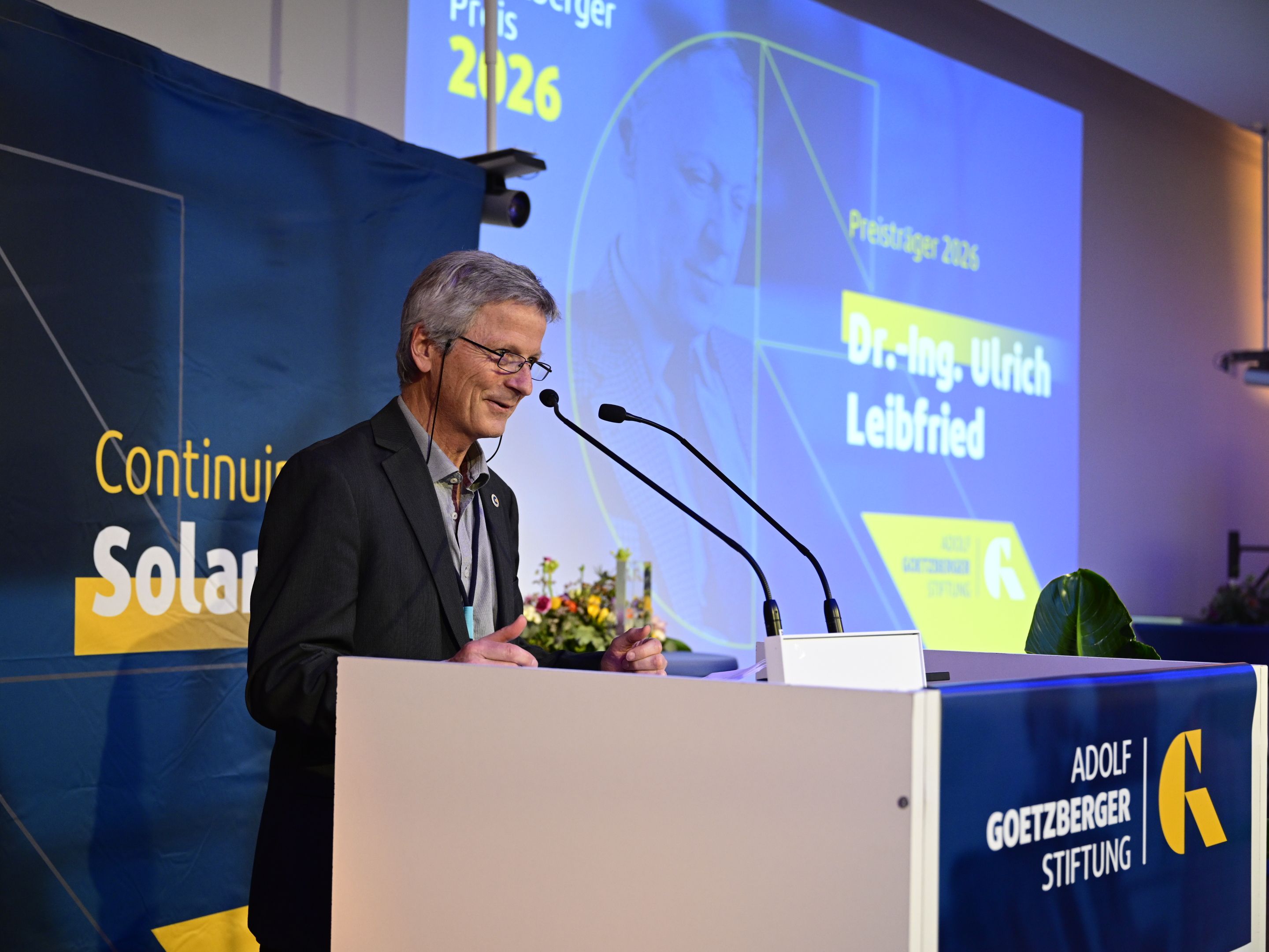 ©Matthias Merz: Dr. Ulrich Leibfried bei seiner Dankesrede nach der Verleihung des Adolf Goetzberger-Preises 2026 für den SOLINK PVT-Wärmepumpenkollektor.